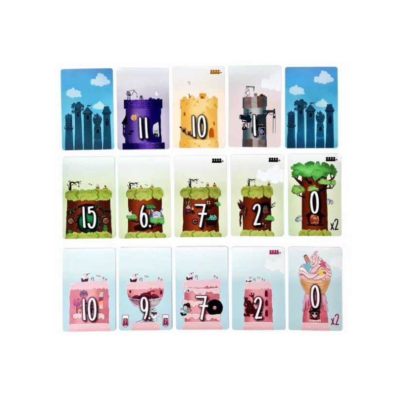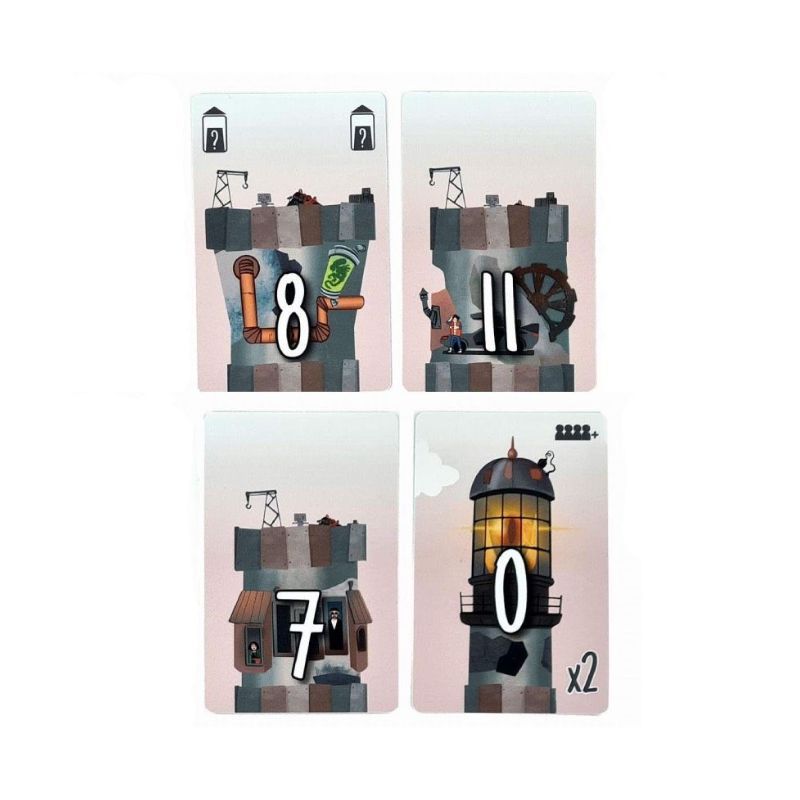Cada ronda, 5 cartas – los bloques de construcción de tus torres – están en subasta. El jugador dispuesto a tomar la mayor cantidad de ellas las gana y debe añadirlas a sus propias torres en crecimiento. Pero ¿por qué no tomarlas todas? Solo puedes construir una torre de cada tipo, y los valores de las cartas en cada torre deben decrecer elegantemente a medida que construyes hacia arriba, así que tomar demasiadas a la vez restringe tus futuras pujas.