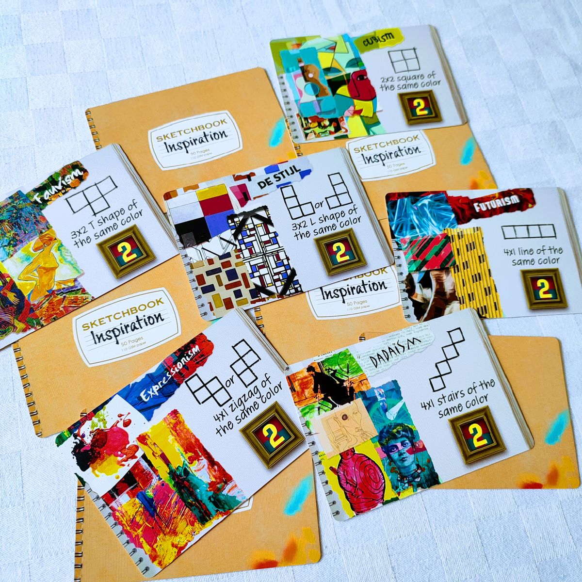 Al inicio de la partida se revelan entre 2 y 3 cartas de puntuación por ronda, de modo que todos sepan qué objetivos deben cumplir. Además, al comienzo de cada ronda, cada jugador recibe una carta de inspiración, que muestra un patrón específico que intentará construir en el lienzo compartido.