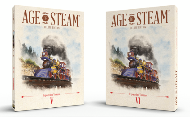 ¡Es hora de avivar las calderas y pulir tus locomotoras con Age of Steam Deluxe: Expansion Volume V & VI, Tableros de Exhibición Promocionales, y el paquete de mapas promocionales Age of Steam Deluxe: Reversteam / Beer & Pretzels!