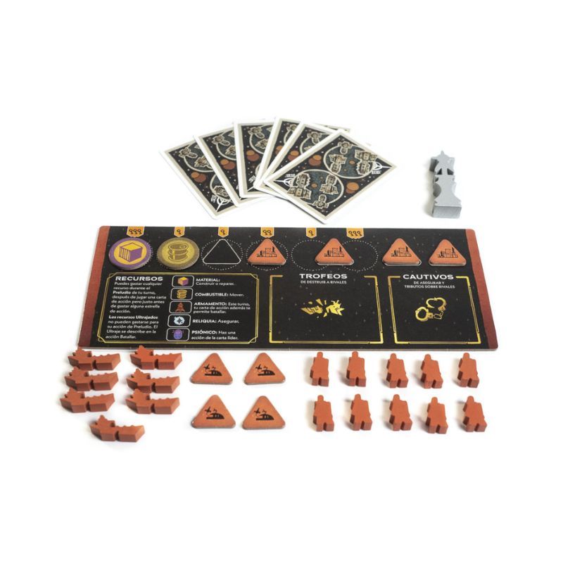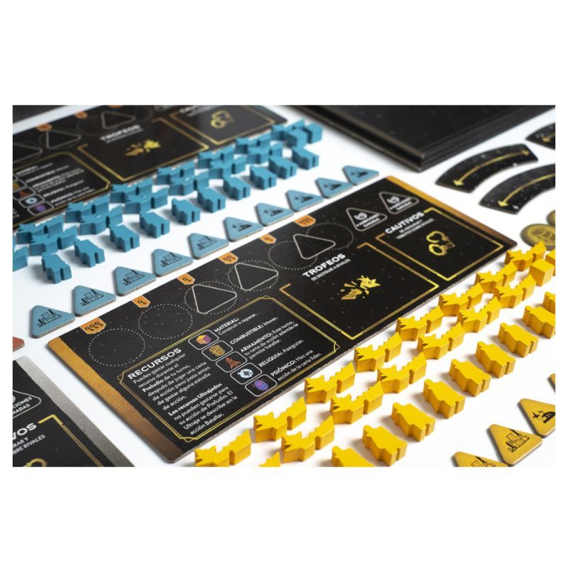 Las batallas se resuelven rápidamente y el atacante elige su nivel de riesgo. Los defensores deben estar preparados con naves defensivas adecuadas y cartas en su tablero. Cada juego contiene un centenar de naves y agentes de madera, 18 dados grabados a medida, un hermoso tablero de seis paneles y toneladas de cartas con más de 60 piezas de arte únicas. El juego base puede jugarse sin las cartas opcionales de líderes y tradición (para una enseñanza más sencilla) o con ellas para un juego más rico, completo y asimétrico. También es el núcleo del juego de campaña (que requiere la expansión Dominio de Arcos), que proporciona una experiencia épica y más temática.