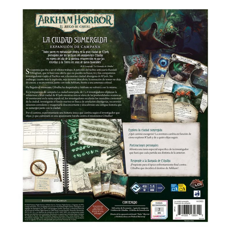 Se suponía que iba a ser el último trabajo. A petición del turbio anticuario Randall Tillinghast, que te hace una oferta que no puedes rechazar, tú y tus compañeros investigadores viajáis al Pacífico sur, a la enorme ciudad alienígena de R’lyeh. Sin embargo, cuanto más la exploráis, más terrores descubrís; la sensación de temor no deja de crecer, y os encontráis, junto con toda Arkham, frente a una amenaza colosal.Ha llegado el momento. Cthulhu ha despertado y Arkham no volverá a ser la misma.En la expansión de campaña La ciudad sumergida, de 1 a 4 investigadores exploran la misteriosa y letal ciudad de R’lyeh mientras ésta se eleva de las profundidades oceánicas. Al aventurarse en la ruina sepulcral, los investigadores escalarán los inestables cimientos de la ciudad, investigarán el fondo marino en busca de artefactos alienígenas, recorrerán sinuosos corredores y maquinaria desconcertante y descubrirán una antigua historia que se sumergió junto con la ciudad.Por el camino, experimentarás una historia única que cambia según el investigador que elijas ¡y que culminará en una apasionante batalla contra el mismísimo Cthulhu!