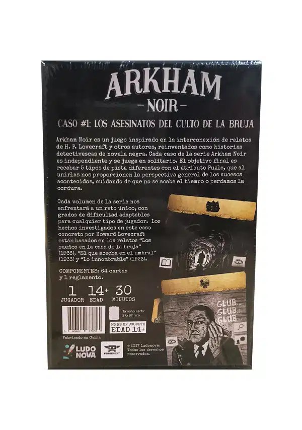 Sumérgete en la atmósfera asfixiante de los relatos de H.P. Lovecraft con Arkham Noir #1: Los asesinatos del culto de la bruja. En este juego de cartas diseñado exclusivamente para disfrutar en solitario, asumirás el rol de un detective privado en la ciudad de Arkham, enfrentándote a sucesos inexplicables y desapariciones que la policía local no puede resolver. Tu objetivo: conectar las pistas antes de que tu cordura se desvanezca por completo.