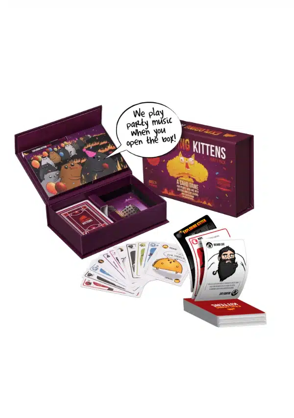 Se trata de una versión gatuna de la ruleta rusa con un gran componente estratégico. Los jugadores van robando cartas hasta que a alguien le sale un Exploding Kitten . Cuando esto sucede, esa persona muere y queda eliminada de la partida (a no ser que tenga una carta de Desactivación, que permite desactivar al Exploding Kitten con armas como punteros láser, friegas de barriga o bocatas de menta gatuna). El resto de las cartas de la baraja sirven para cambiar de lugar, mitigar o evitar a los Exploding Kittens.