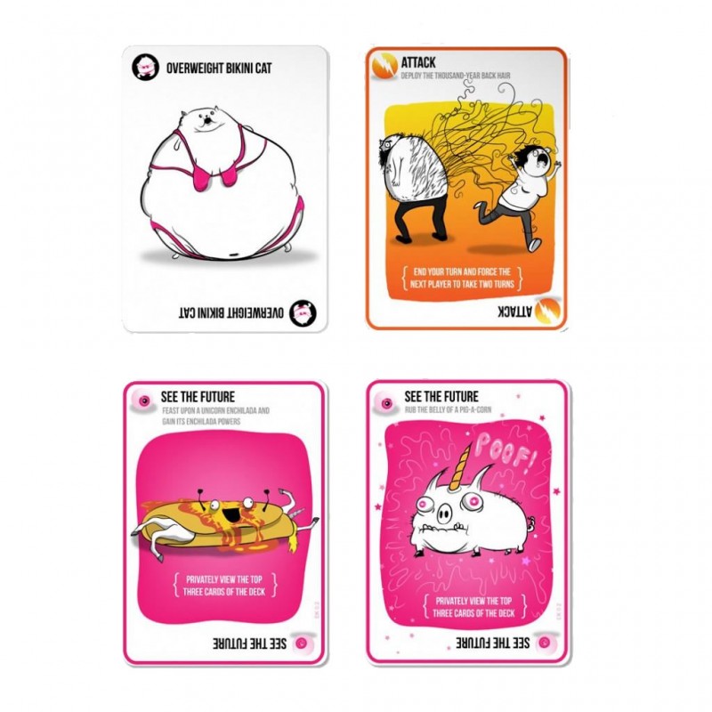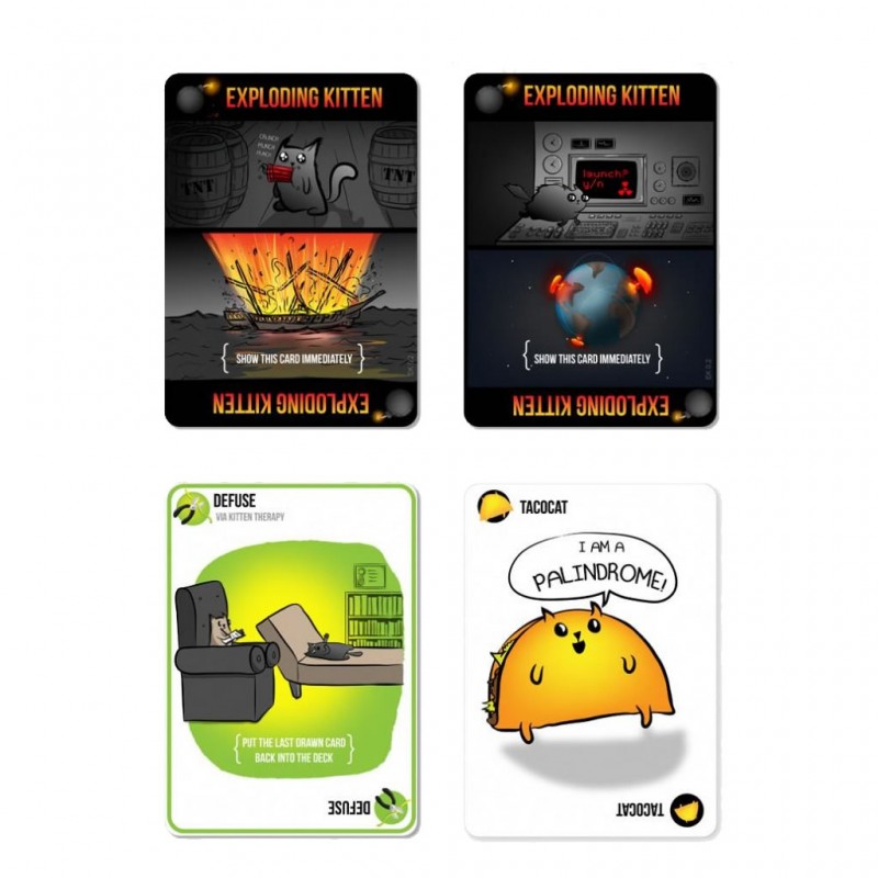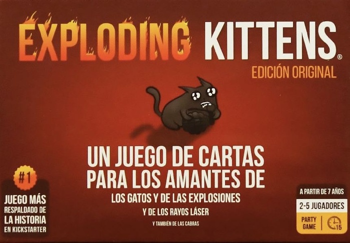 Exploding Kittens es una versión gatuna de la ruleta rusa. Los jugadores se turnan para robar cartas hasta que alguien saca un gatito explosivo y pierde el juego. La baraja incluye cartas que te permiten evitar la explosión espiando cartas antes de robar, obligando a tu oponente a robar múltiples cartas o reordenando el mazo. El juego se vuelve más intenso con cada carta robada, ya que menos cartas en el mazo significan más posibilidades de sacar el gatito y explotar en una bola de fuego de hipérbole felina.