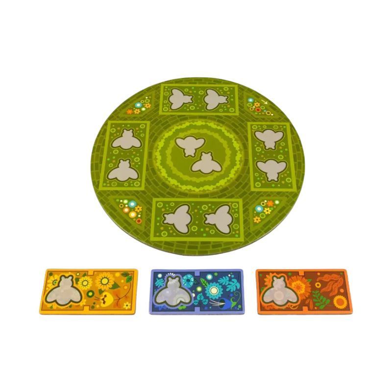 4 tableros de Jardín, 52 fichas de Flor, 12 fichas de Flor pequeña, 1 tablero de Campo, 50 Abejas, 1 ficha de Sol, 1 ficha de Participante inicial, 6 fichas de 5 Abejas, 3 fichas de IA, 1 bloc de puntuación, 1 bolsa.