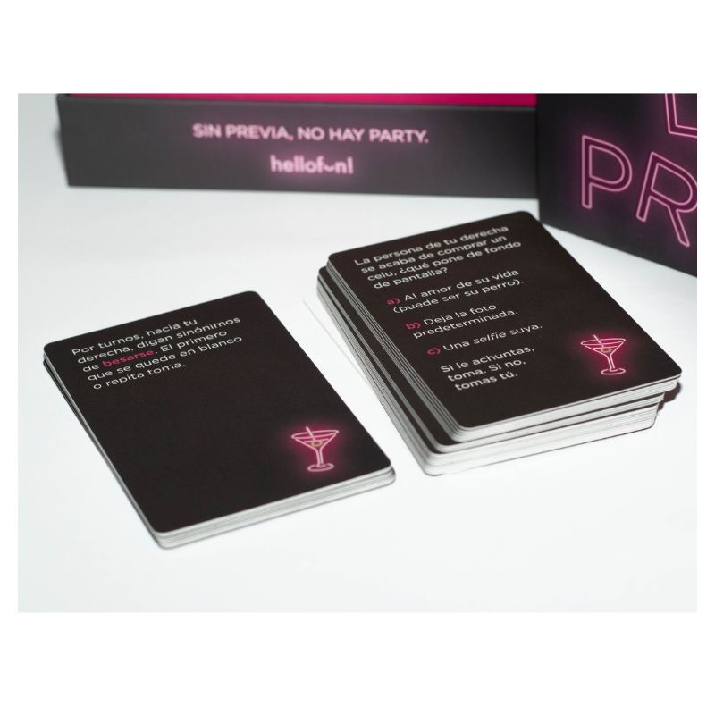 La Previa es el party game ideal para encender cualquier reunión entre amigos. Con 275 cartas llenas de retos, preguntas, pruebas y dinámicas pensadas para romper el hielo, reírse sin control y transformar un par de copas en una noche verdaderamente inolvidable.