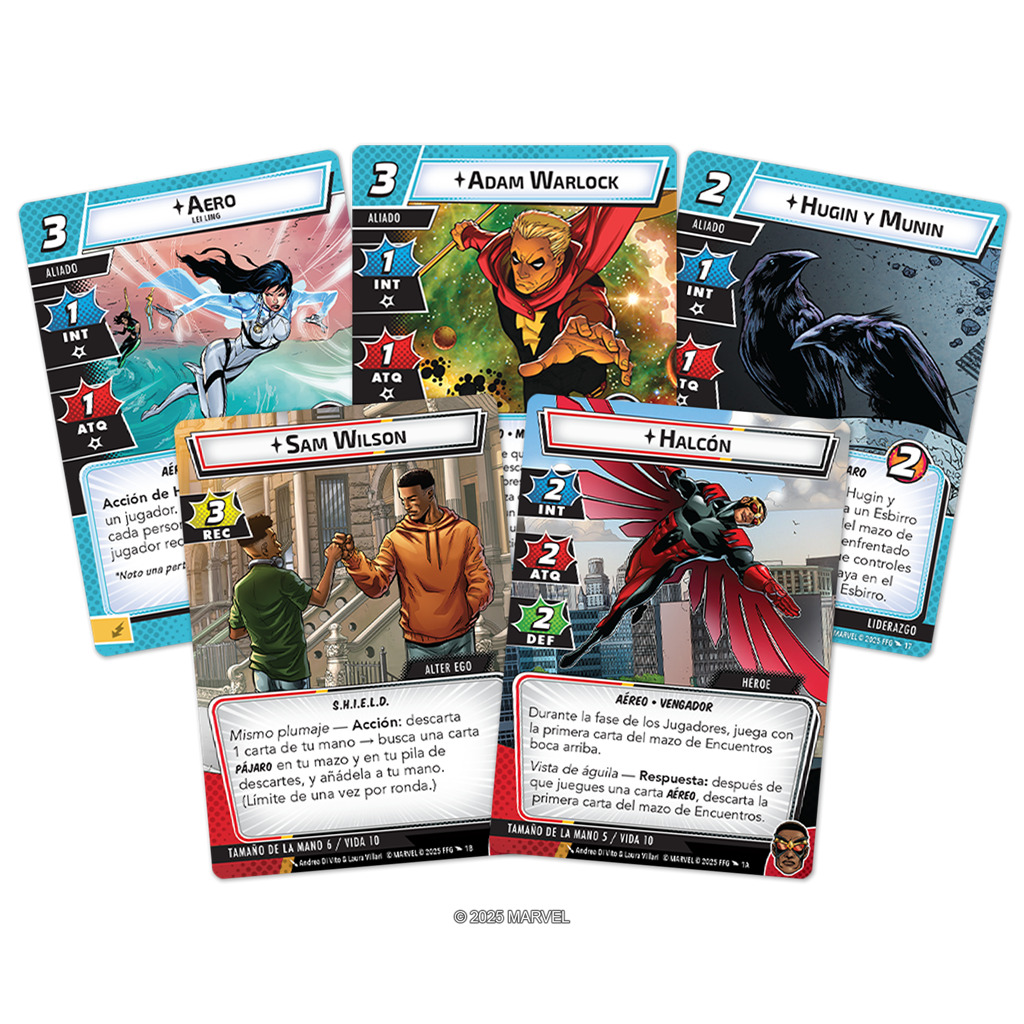 Sam Wilson, también conocido como el Halcón, vuela utilizando un arnés de alas de vibránium de tecnología punta. Aprovecha su superioridad aérea y su conexión empática con las aves, especialmente con su fiel mascota Ala Roja, para brindar a sus camaradas Vengadores una importante ventaja táctica. Como compañero habitual del Capitán América, Sam ha llegado a embrazar su escudo y adoptar el título de Capitán América para ejercer como un alado símbolo de la verdad.