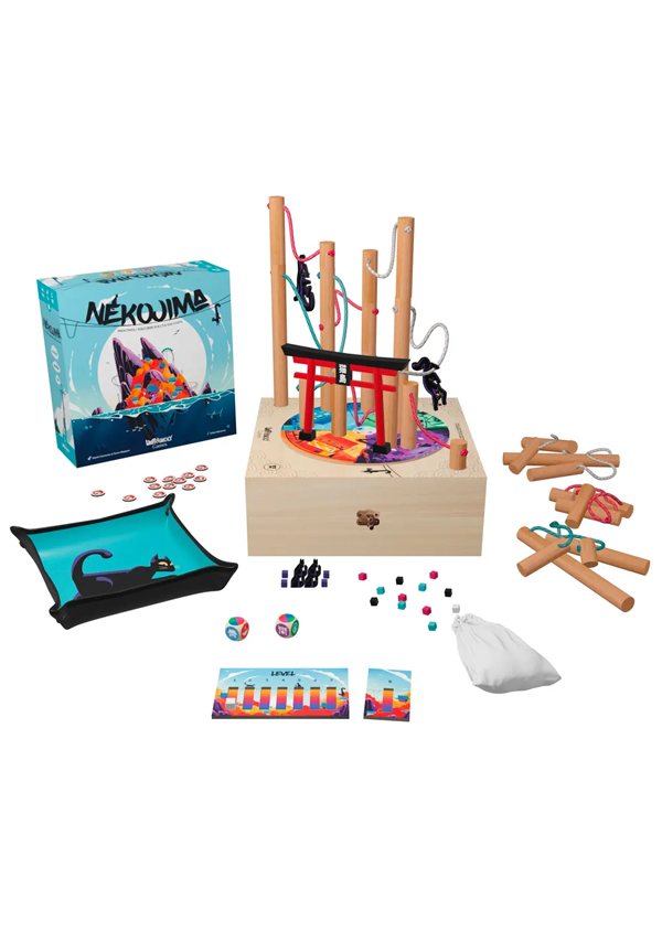 Nekojima es un juego de habilidad y destreza hecho de madera, en el que deberás mantener en equilibrio toda la instalación. Por turnos, los jugadores colocan o apilan denchuu —電柱, o postes eléctricos— respetando las ubicaciones designadas, y sin que los cables colgantes toquen otros elementos. ¡Ten cuidado de no ser tú quien derribe la estructura!
