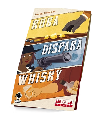 Roba, Dispara, Whisky es un rápido duelo de cartas que no se decide por piedra, papel o tijera, sino que por oro, pistolas y whisky.