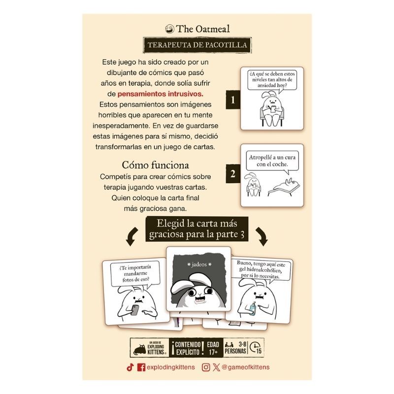 Un juego de cartas en el que tienes que crear cómics muy (des)agradables. Este juego ha sido creado por un dibujante de cómics que pasó años en terapia, donde solía sufrir de pensamientos intrusivos. Estos pensamientos son imágenes horribles que aparecen en tu mente inesperadamente. En vez de guardarse estas imágenes para sí mismo, decidió transformarlas en un juego de cartas. Es un juego que consiste en crear cómics de 3 escenas, empezando por una pregunta, seguida de una respuesta y, finalmente, un tratamiento psicológico. Ganáis 1 punto si vuestro tratamiento es el elegido como la mejor opción para terminar el cómic.