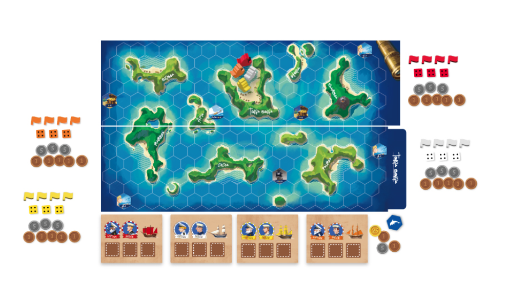 Una vez que todos los dados han sido colocados, por turnos los jugadores mueven su barco, idealmente llegando a las islas antes que otros y dejando una de sus fichas allí. Cada vez que llegas a una isla, recibes $25 del banco, pero debes pagar $5 a cada jugador que haya llegado allí antes que tú. Al final de una ronda, los jugadores cobran los salarios junto a los puestos de capitán y primer oficial que tienen sus dados.