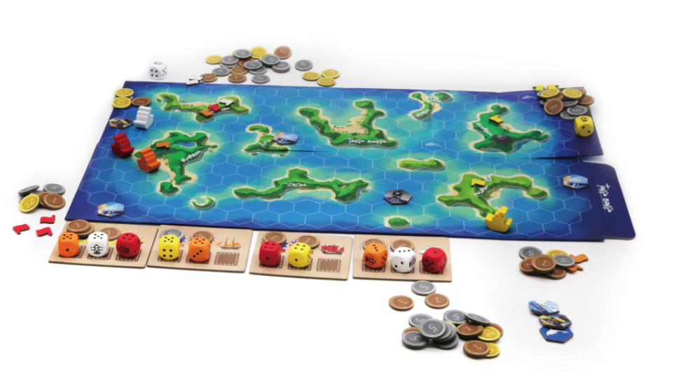 Sin embargo, ganar la carrera no gana el juego; lo que importa es tener la mayor cantidad de dinero. Cada jugador tiene espacio para tres marineros (representados por dados) en su barco, y al comienzo de una ronda, los jugadores deciden por turnos cuánto dinero ofrecer a los marineros que servirán como su capitán y primer oficial en esa ronda. (El grumete siempre trabaja gratis). A continuación, por turnos, los jugadores lanzan sus dados y luego asignan un dado a cada otro barco — ¡nunca al suyo propio! Si colocas un dado con un valor igual o mayor en un barco donde ya hay un dado presente, desplazas ese dado anterior a un rol menor. (En resumen, los barcos siempre terminan con el dado más alto en la posición de capitán). Un lado de cada dado tiene un marinero mareado, que no va al mar esa ronda, por lo que no todos los barcos estarán necesariamente completos.