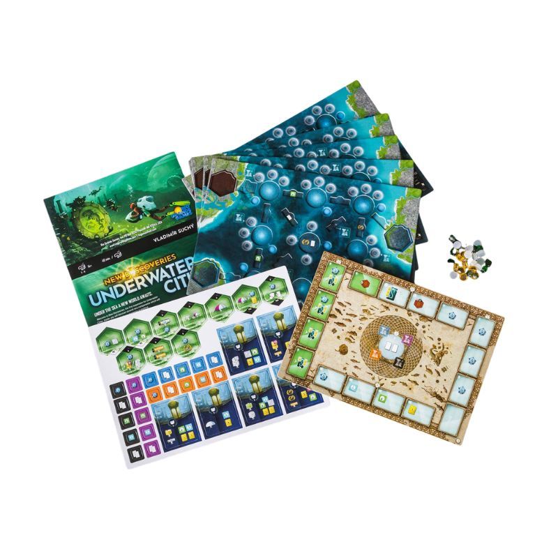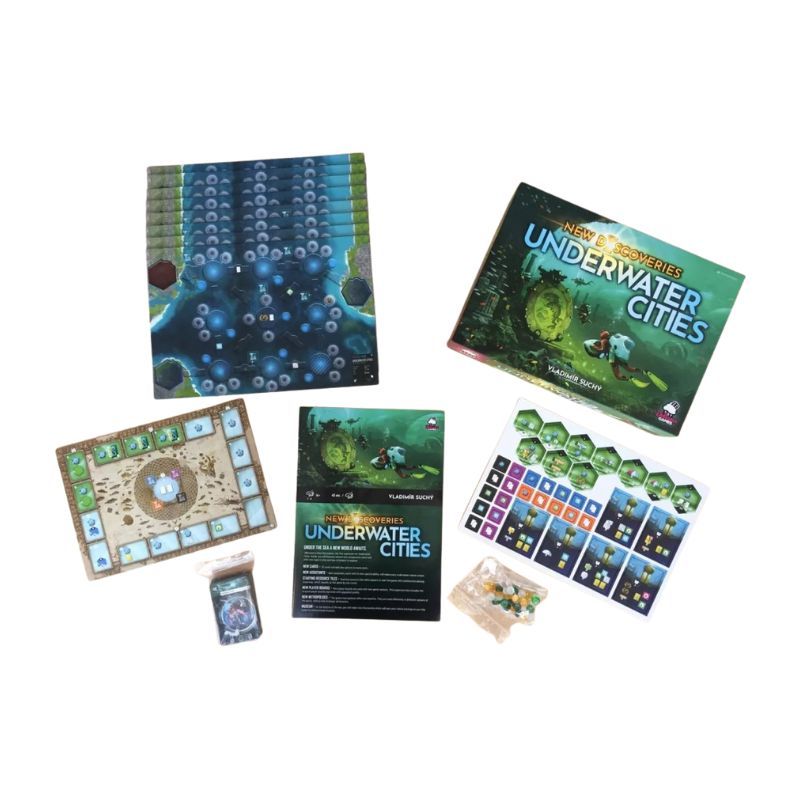 La esperada expansión para Underwater Cities incluye varios módulos que se pueden añadir al juego básico, como nuevas cartas de ayudante o nuevas metrópolis, así como nuevos tableros para los distintos modos de juego, todos ellos en un nuevo formato en cartón duro y con los huecos troquelados para colocar los distintos componentes y nuevas cartas que se añaden a las del juego básico y amplían las estrategias y las formas de puntuar al final de la partida.