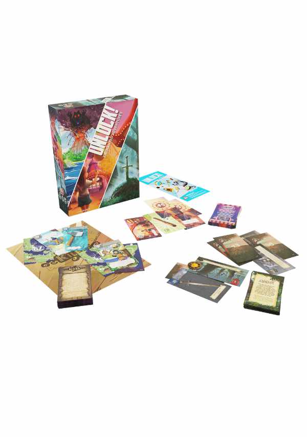 1 reglamento, 1 tutorial de 10 cartas, 3 aventuras (180 cartas), 1 mapa