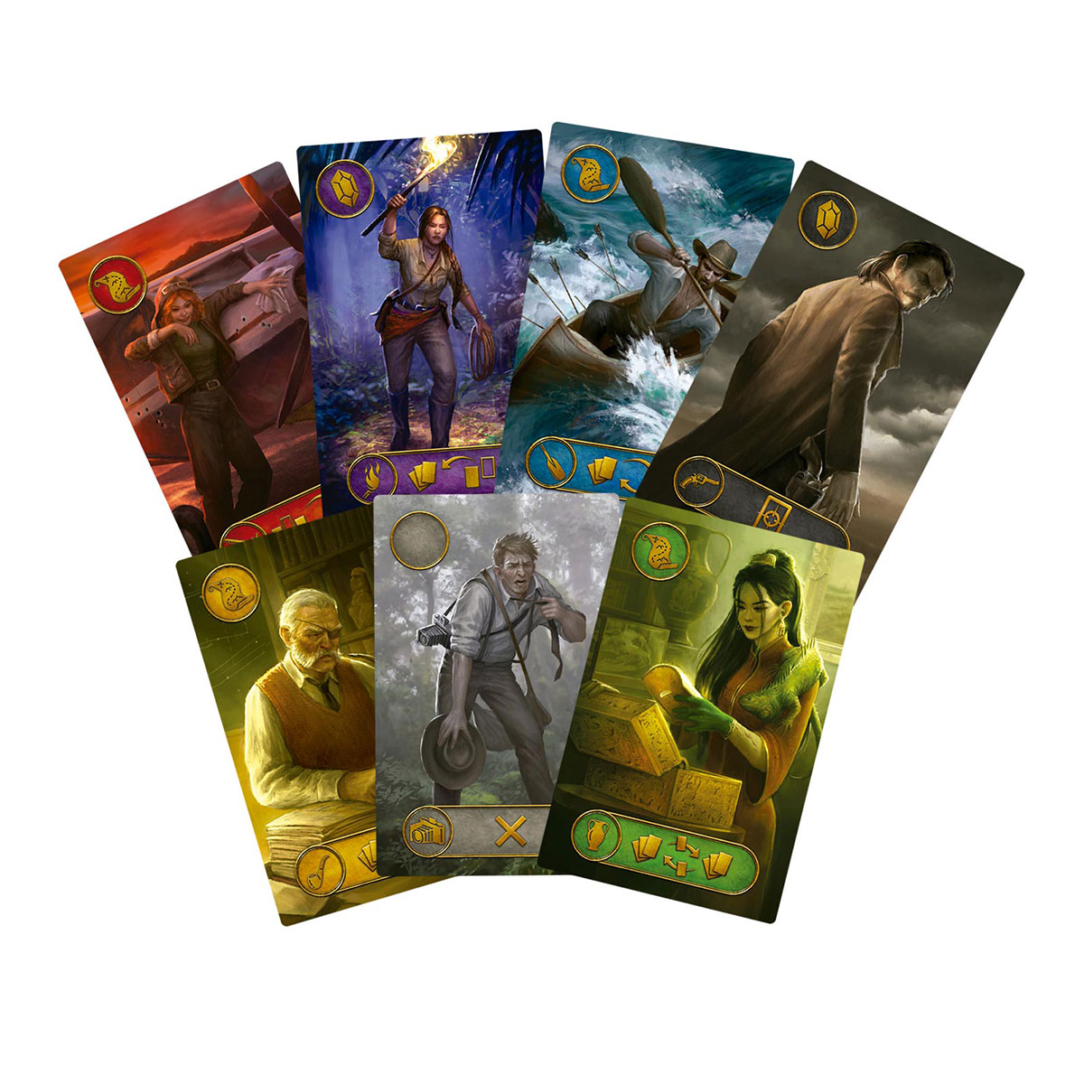 Cada jugador empieza con 6 cartas de personaje (los miembros de la expedición). Cada uno de ellos tiene un poder único que afecta a la partida de distintas formas, desde intercambiar cartas con otros jugadores hasta devolver cartas a la mano o intimidar a ciertos personajes.