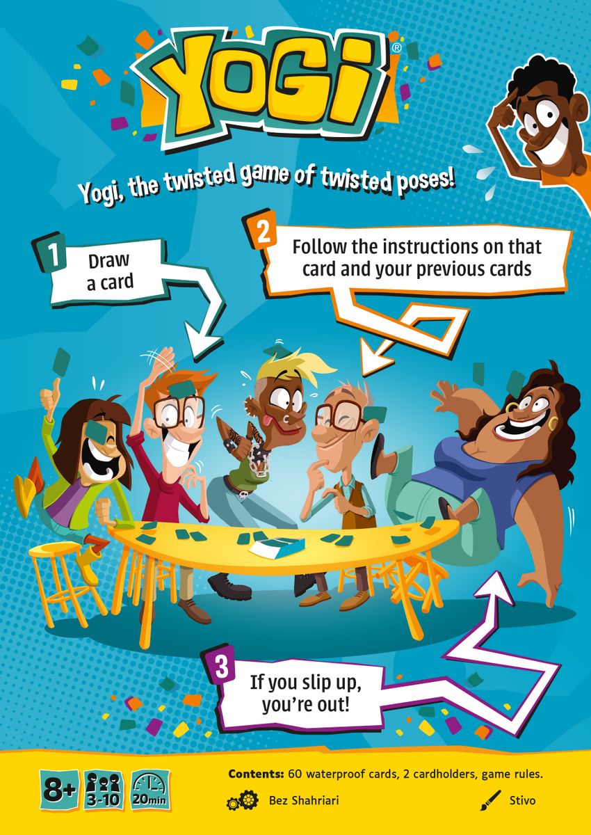 Yogi es un juego que hará retorceros a ti y a tus amigos, ¡y que os riáis mucho! Cada turno saca una carta que te indicará cómo debes sujetarla; encima de la cabeza, contra la punta de la nariz, con el cuello… Mantén las cartas en su sitio porque si caen estarás eliminado.