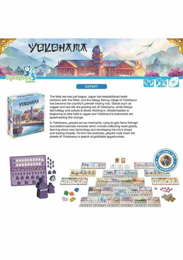 En YOKOHAMA, cada jugador interpreta a un comerciante en la era Meiji que busca ganar prestigio a través de un negocio exitoso. Para lograrlo, deberá construir tiendas, ampliar sus canales de venta, aprender diversas técnicas y, por supuesto, cumplir con pedidos comerciales provenientes del extranjero.