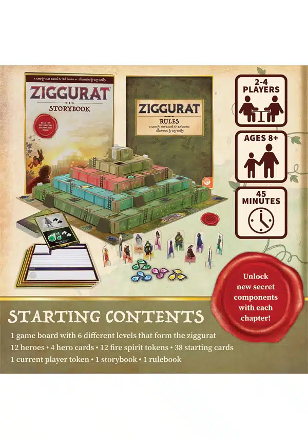 Ziggurat es un juego cooperativo legacy, en el que la historia se desarrolla a lo largo de seis capítulos. Durante la campaña, los jugadores tomarán decisiones que afectarán permanentemente todas las partidas futuras. A medida que avances, irás añadiendo nuevas reglas, materiales y elementos al tablero, transformando el juego de forma irreversible.
