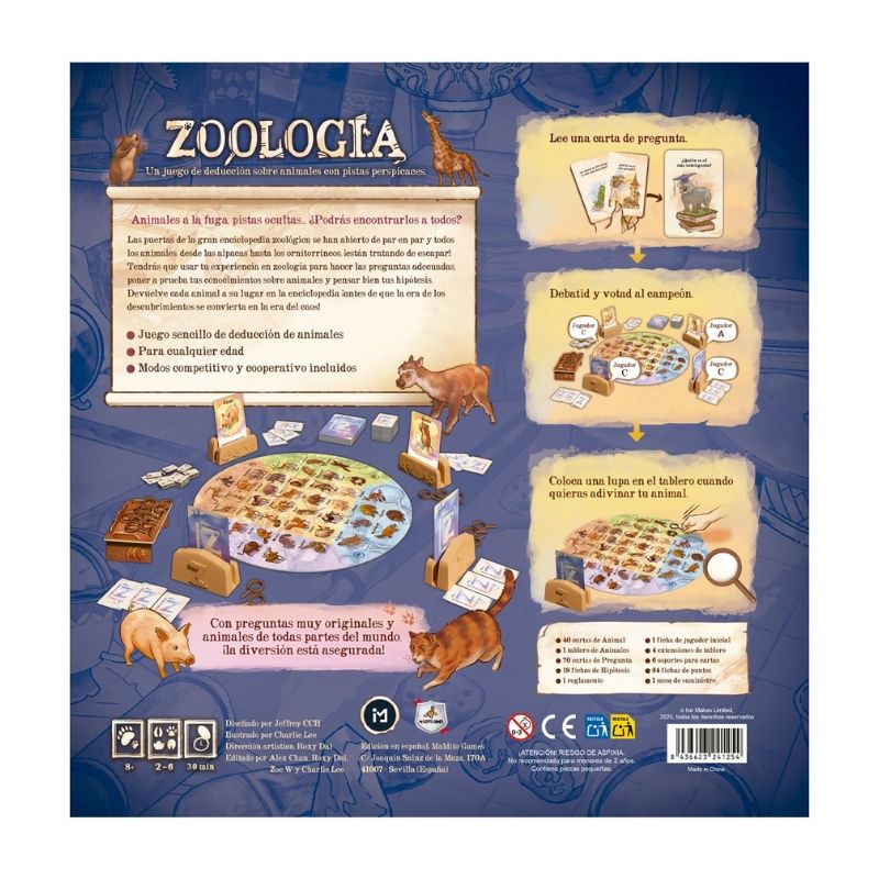 Zoología es un juego sencillo de deducción de animales, que involucrará a todos los miembros de tu familia (sin importar su edad), en el que competiréis o cooperaréis para deducir animales por su tamaño, simpatía, inteligencia, fuerza…